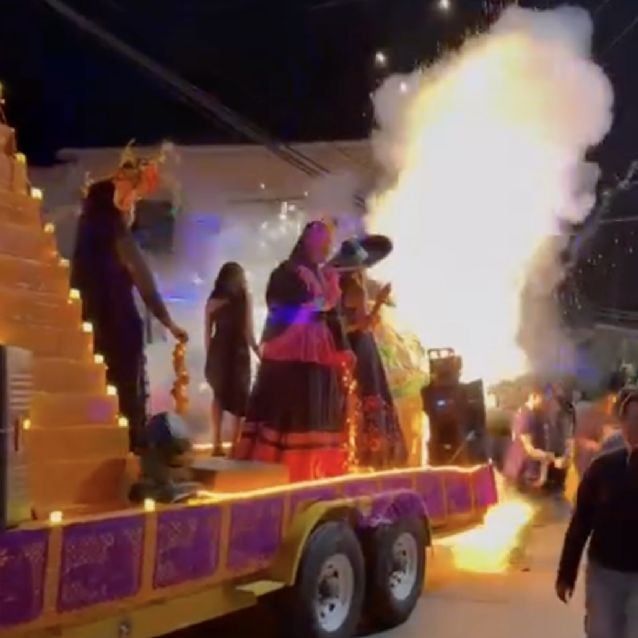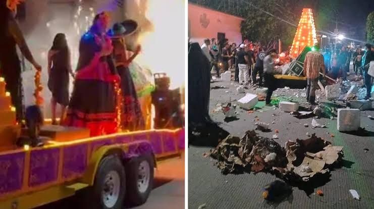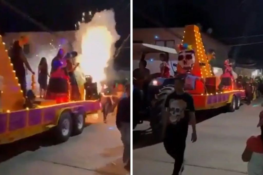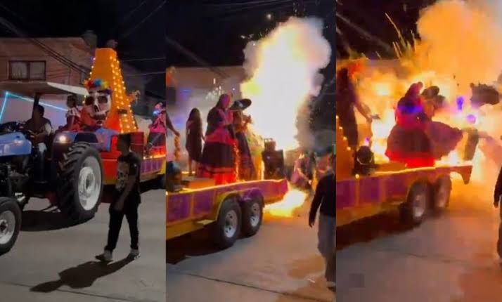 En un video que se hizo viral en redes sociales, se aprecia a un tractor que transportaba una plataforma decorada con motivos alusivos al Día de Muertos. Aparentemente una chispa encendió la pirotecnia que formaba parte del carro alegórico, lo que derivó en una fuerte estallido.