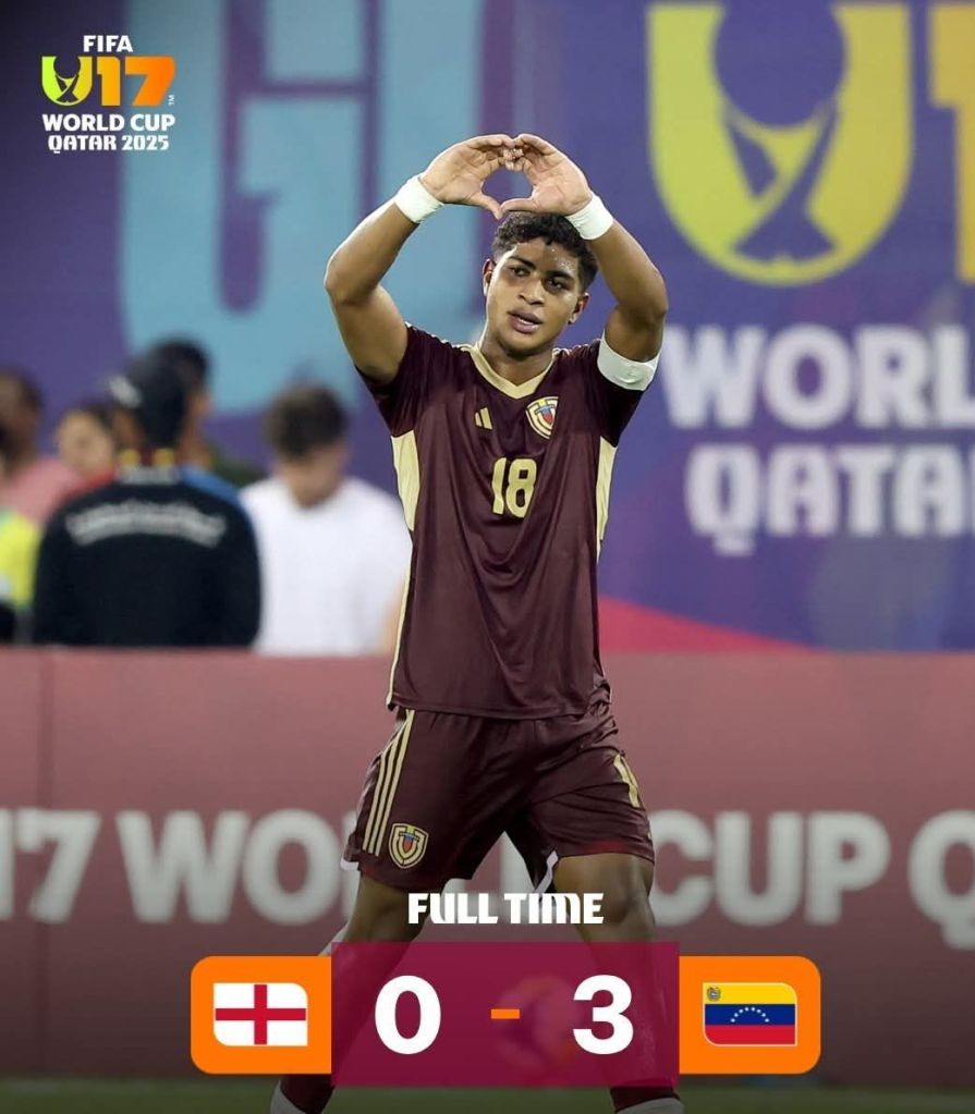 El Mundial Sub 17 que se desarrolla en Qatar entregó una de las sorpresas inesperadas en la primera fecha. Es que Venezuela dio el golpe frente a Inglaterra y se impuso con autoridad para sellar una goleada histórica de 3-0 gracias a las conquistas de Román Davis, Dioner Fuentes y Eider Barrios.