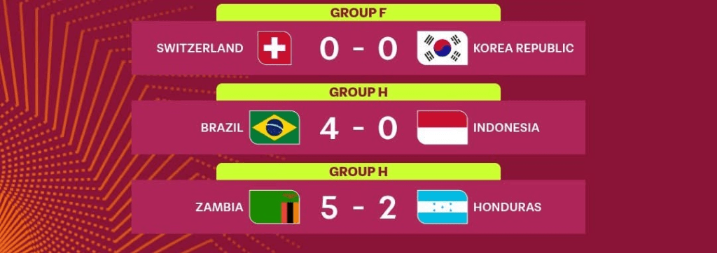 Suiza y Corea del sur no se hicieron daño y empataron sin goles, Brasil goleo a Indonesia con un marcador de 4-0.