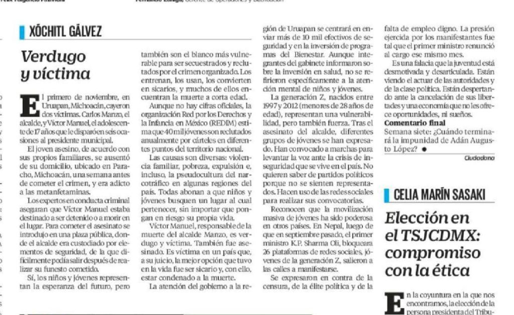Galván dijo menciono en la presentación de su columna «El primero de noviembre, en Uruapan, Michoacán, cayeron dos víctimas. Carlos Manzo, el alcalde, y Víctor Manuel, el adolescente de 17 años que le disparó en seis ocasiones al presidente municipal».
