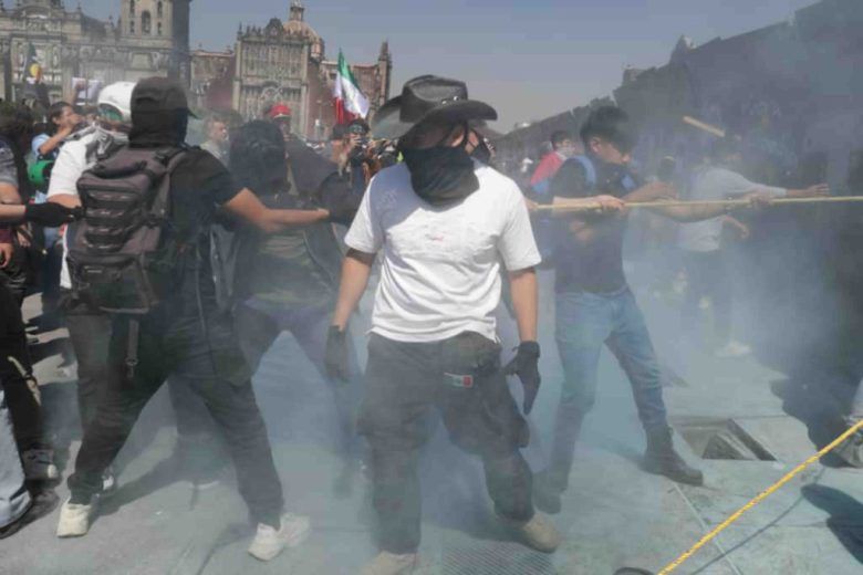 Para ese momento, el lado sur del Zócalo ya mostraba un gran hueco, mientras policías resistían con sus escudos para evitar el ingreso de los manifestantes. En tanto, las personas encapuchadas seguían jalando más vallas con cuerdas y lanzando piedras y otros objetos; algunos ocasionaban detonaciones intermitentes.