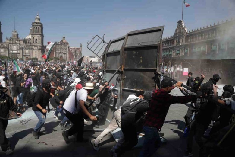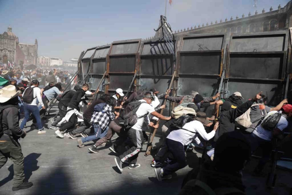 Después de varios intentos, los vestidos de negro lograron derribar una valla de tres metros de altura, pero los policías bloquearon ese punto para evitar que los manifestantes ingresaran. Cinco minutos después, los inconformes retiraron dos placas metálicas más al costado derecho de Palacio Nacional.