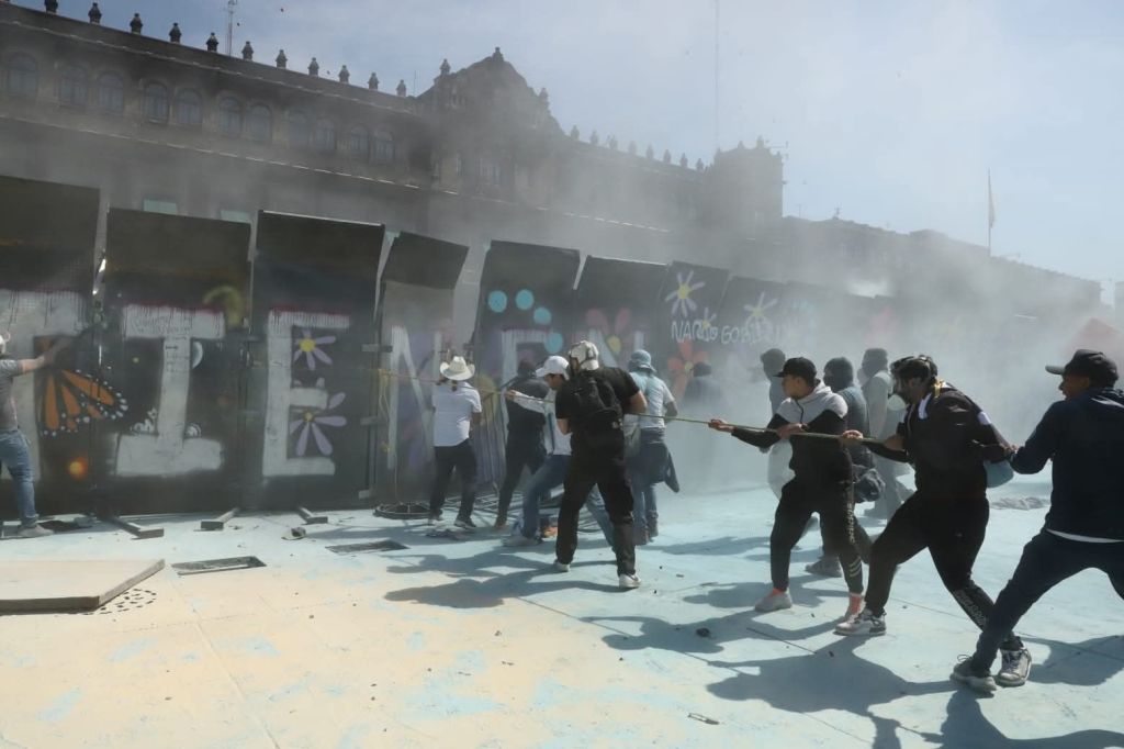 Poco después de las dos de la tarde, un muro compuesto por nueve vallas metálicas fue arrancado del resto de la estructura que resguardaba el recinto. La pieza fue arrastrada hasta la plancha del Zócalo, donde finalmente cayó al piso.