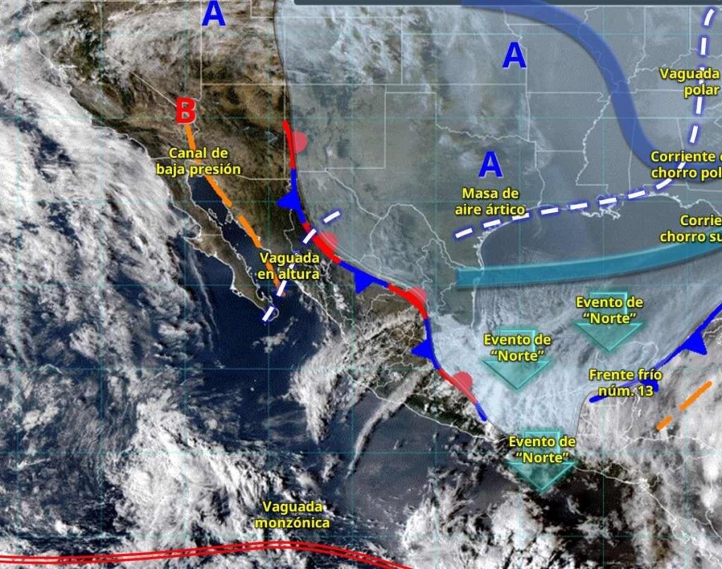 Se pronostican lluvias puntuales muy fuertes en Baja California (norte y centro); puntuales fuertes en Sonora, y lluvias con intervalos de chubascos en Baja California Sur, acompañadas de viento con rachas de 40 a 60 km/h en la región, así como descenso de las temperaturas y condiciones para la posible caída de nieve y/o aguanieve en sierras del norte de Baja California y del noroeste de Sonora.