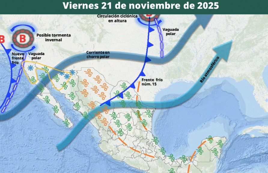 Por otro lado, el frente frío 15 se extenderá sobre el noreste de México y continuará su interacción con la corriente en chorro subtropical, manteniendo la probabilidad de vientos fuertes y lluvias con intervalos de chubascos en Coahuila, Nuevo León y Tamaulipas.