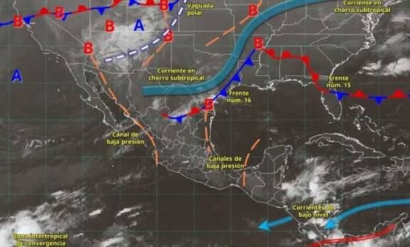 El Servicio Meteorológico Nacional (SMN) prevé para este martes que el frente frío 16 se extenderá sobre el norte y noreste de México, y en interacción con la corriente en chorro subtropical y con un canal de baja presión, ocasionará lluvias puntuales fuertes con descargas eléctricas en Nuevo León y Tamaulipas, así como chubascos en Coahuila y San Luis Potosí.