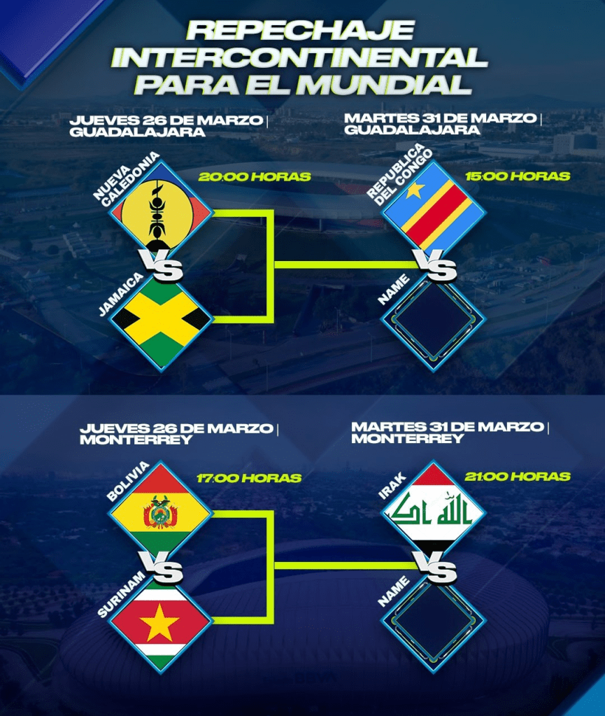 || Guadalajara y Monterrey serán sedes de los duelos que otorgarán los últimos dos boletos mundialistas, con 3 partidos cada uno disputarán en el mes de Marzo de 2026