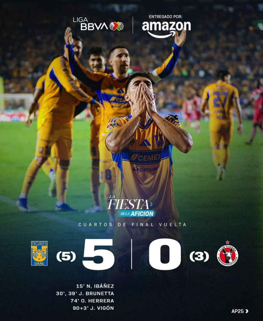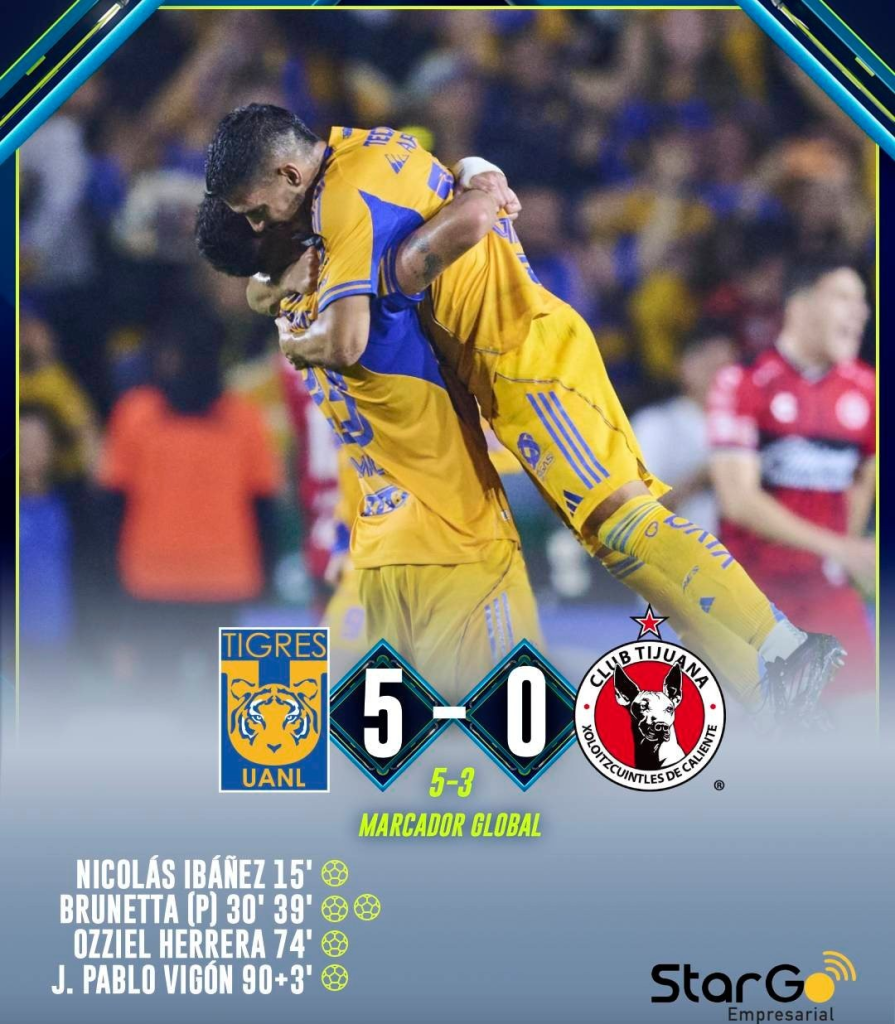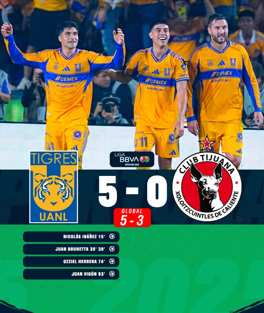 Tigres completó una noche histórica en el Estadio Universitario al vencer 5-0 a Xolos en el partido de vuelta de los cuartos de final del Apertura 2025, resultado que les permitió darle la vuelta al marcador global y sellar su pase a las semifinales ante un “Volcán” encendido de principio a fin.