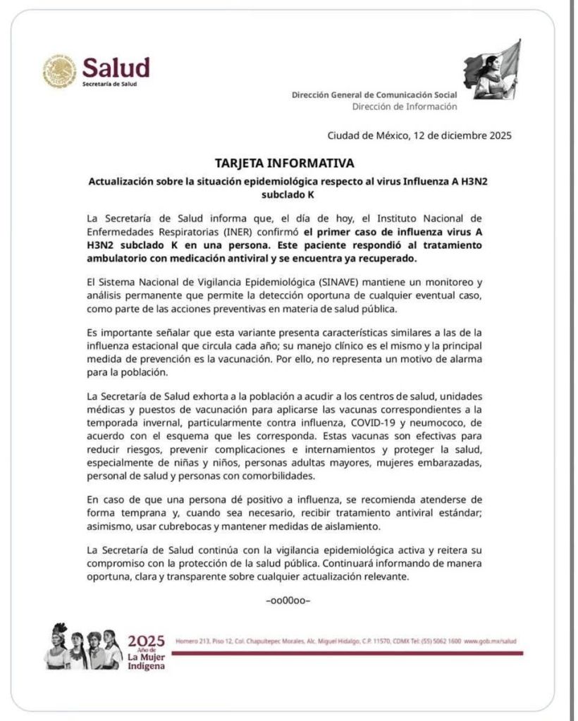 El Gobierno de México confirmó el primer caso de influenza A H3N2 subclado K en el país.