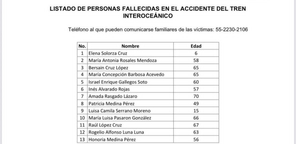 El descarrilamiento del Tren Interoceánico del Istmo de Tehuantepec dejó 13 personas muertas, cuyos familiares recibirán apoyo económico que podría ascender a 400 mil pesos.